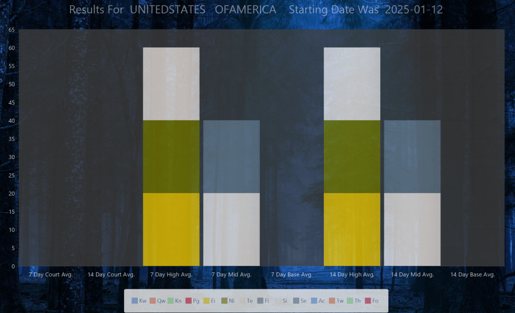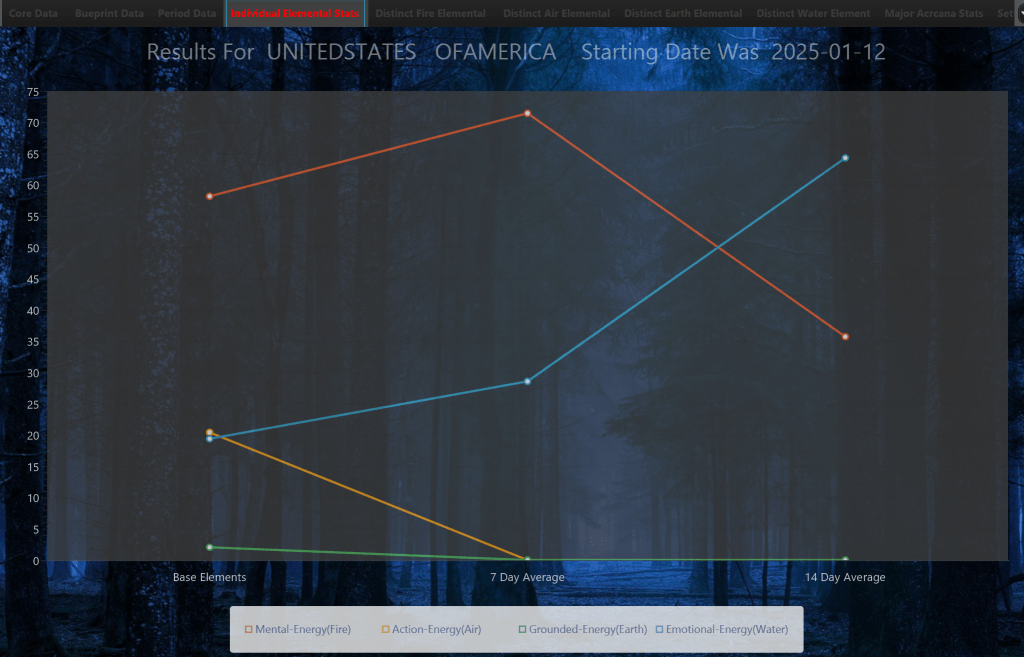 After taking a brief look at the country’s chart for the next couple of weeks and reducing the values to elements, I’m going to say emotions are raging. The element of water is going to continually rise in the chart, to a max of about 65% of the elemental presence over the next 14 days. The second element in play over the period is fire. Which is actually higher over the next seven days, reaching a peak of about a 70% complete presence. However, it will decrease in the following week, to a low of about 35%.
