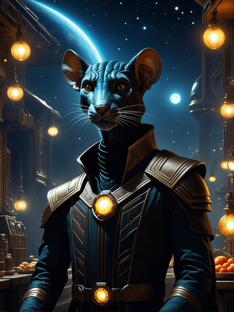Astronomer Lyran, often lost in the cosmos, spends most of her time stargazing. Her knowledge of celestial navigation is crucial for planning space battles in the Orion Wars. Despite her serene exterior, Lyra carries the weight of those turbulent times, making her an intriguing figure on the station.