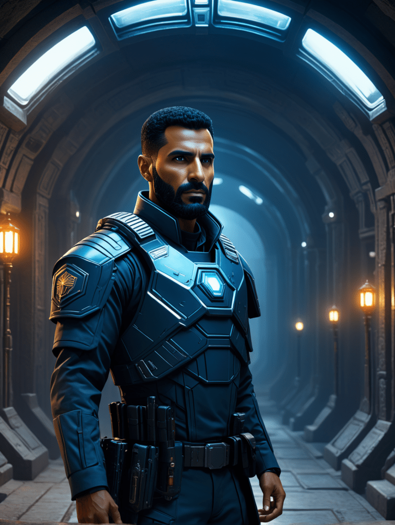 Auxiliary Security Officer Tarek, in charge of securing the Catacombs area, is always vigilant. His experience from the Orion Wars has honed his skills in counter-intelligence and security measures. Tarek’s stoic presence and meticulous nature are vital in protecting the station from internal and external threats.
