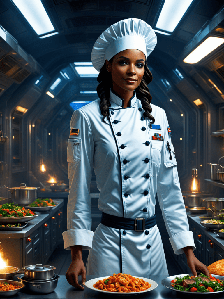 Chef Zara, known for her eclectic recipes, runs the station’s mess hall. Providing meals for troops amidst the Orion Wars, her culinary skills and comforting presence are vital for crew morale. Zara’s past is a mosaic of hidden bravery and resilience, with tales of her efforts to boost spirits during the darkest times.
