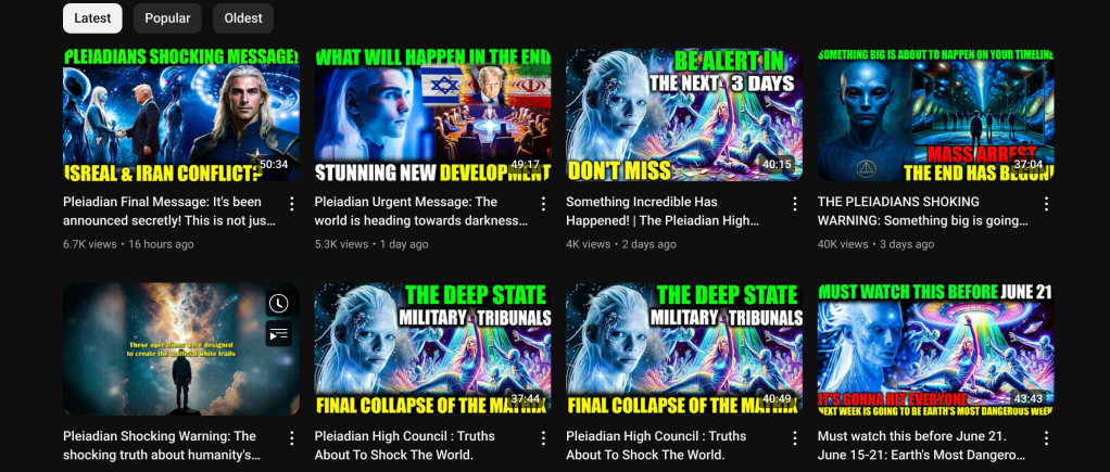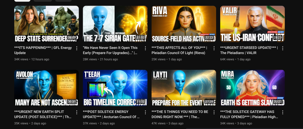 Probably because they are fearful, or they need a good click bait headline for income. There are also a bunch of videos talking about the Solstice. It’s funny how it progresses too. Finally ending with a video saying “URGENT NEW EARTH SPLIT UPDATE”…….. This is the equivalent of the people on X who constantly post things like….. “BREAKING !!!!!” or “RED ALERT!!!!!” just to get people to view their content.