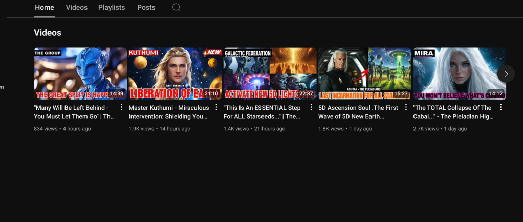 The above is some more You Tube content from a account called “Celestial Wisdom”……… Same type of deal, lots of AI. Content overly obsessing over Human Earth Drama. Presenting people with very click bait headlines and images to get them to click the links….